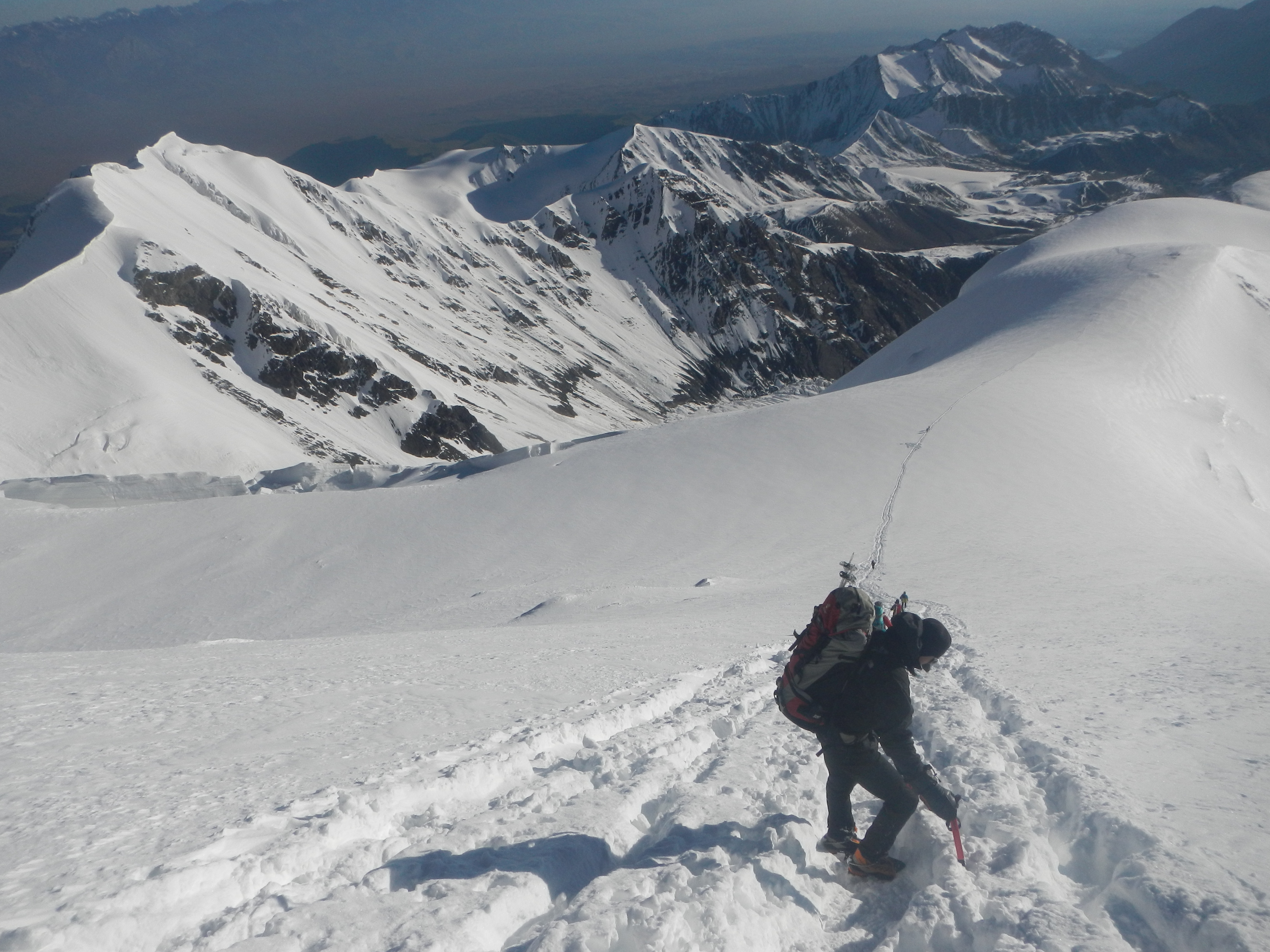 Nenavezani smo se spustili v temno kotanjo in se nato začeli vzpenjati po dolgem grebenu gore, kjer je pihal veter s strašno močjo in metal kristale vsevprek. Po nekaj minutnem gibanju se je telo končno malo ogrelo. Težko, težko sem čakal prve sončne žarke, ki bi lahko umilili veter. Včasih tudi dan prinese spremembo vremena! Greben je na momente postajal prijaznejši in lahko si se skril za kakšen rob skale, pogoltnil si energetski gel in se malo odpočil. Papir si enostavno prepustil vetru, ki ga je odnesel v vesolje. A mirovati, sanjati se v takih situacijah ne sme. Vse kar se ne premika, v hipu otrpne in se strdi. V višinah so zakonitosti povsem druge. Veter in ledeni kristali, ki so nas bičali so postali sovražnik številka ena, mraz pa je rezal naše roke skozi rokavice. Gora se nas je dobesedno otresala. Saj je bilo na trenutke tudi lepo videti valove belih vrhov na južno stran, v Tajikistan, a tokrat situacija ni bila za romantiko. Prebičani smo se po štirih urah obrnili. 6600m nad morjem! Ali je to poraz ali …. Verjetno ni bila slabost v energiji telesa, mislim, da je bilo več napak v nespoštovanju vetra in mraza. Napoved vremena je bila že v naprej točno povedana, težavna, vetrovna. Težko je razumeti, da se lahko na enem mestu temperatura spreminja za petdeset stopinj. Sicer pa je bilo na grebenu gore še več stvari, ki jih nismo razumeli! Pokopati vse, za kar se pripravljaš in odrekaš pol leta, je huda preizkušnja. V takih situacijah odločajo trenutki moči in trenutki slabosti, ugodja, neugodja, a nagla odločitev je le ena.