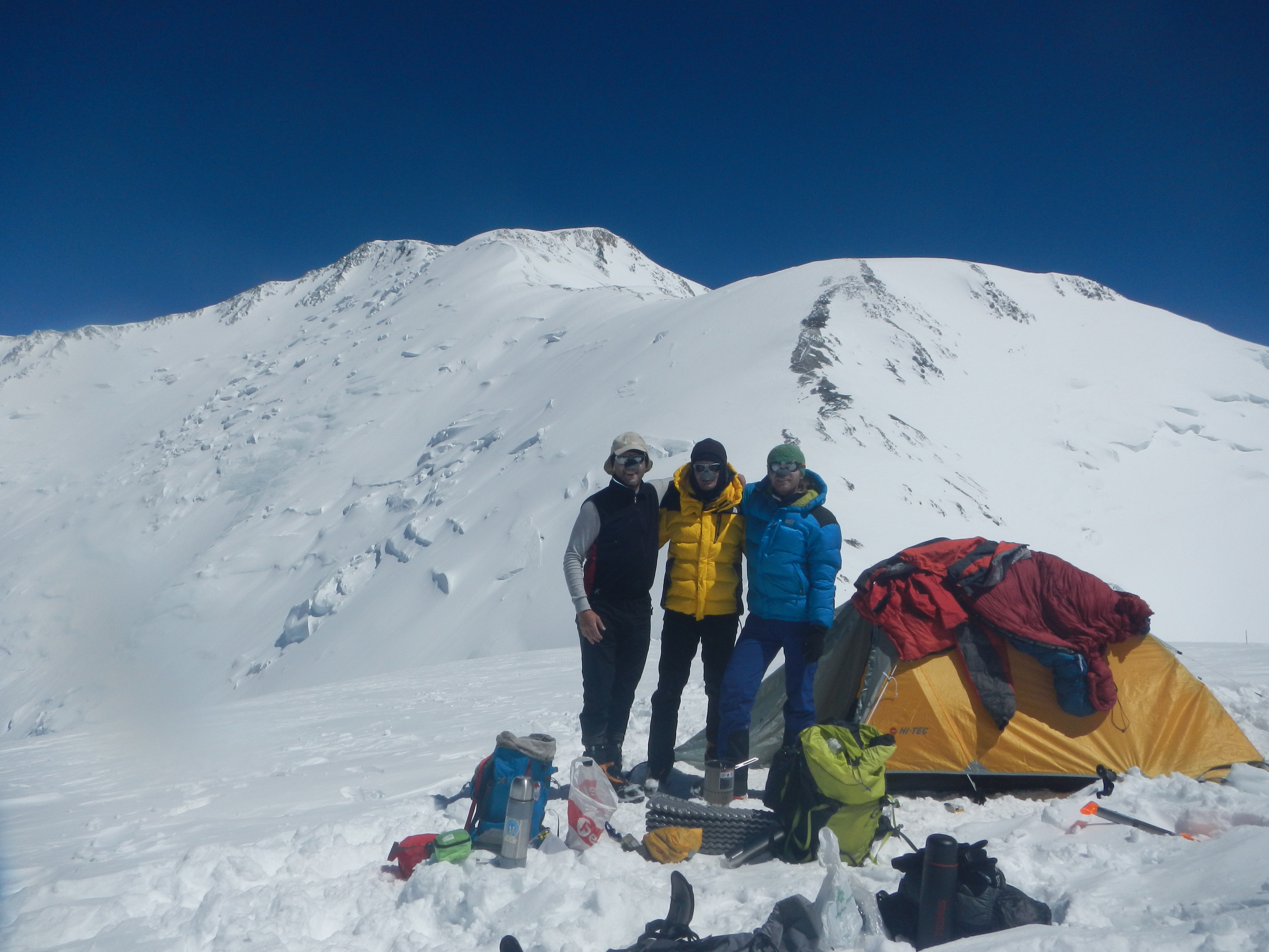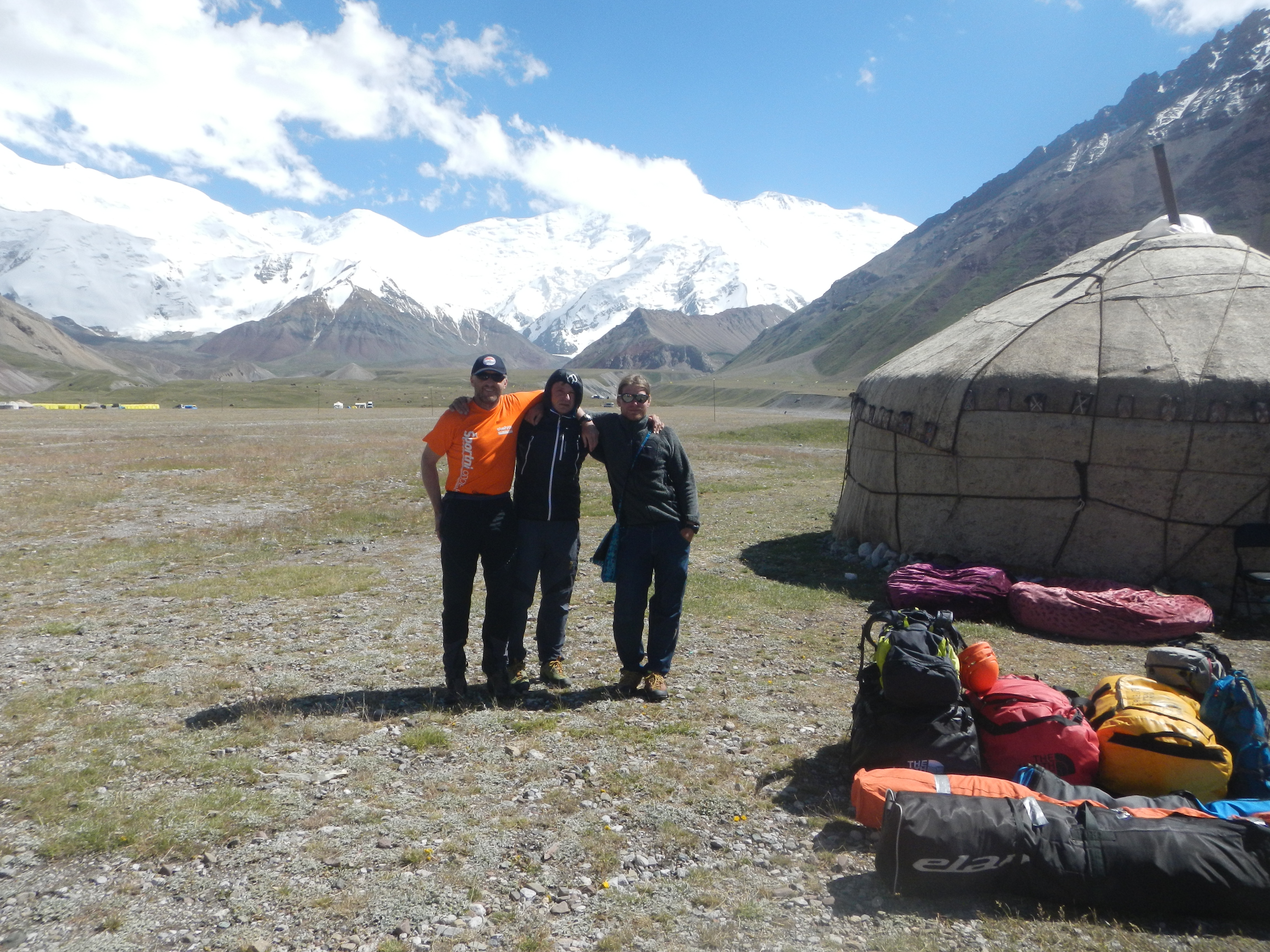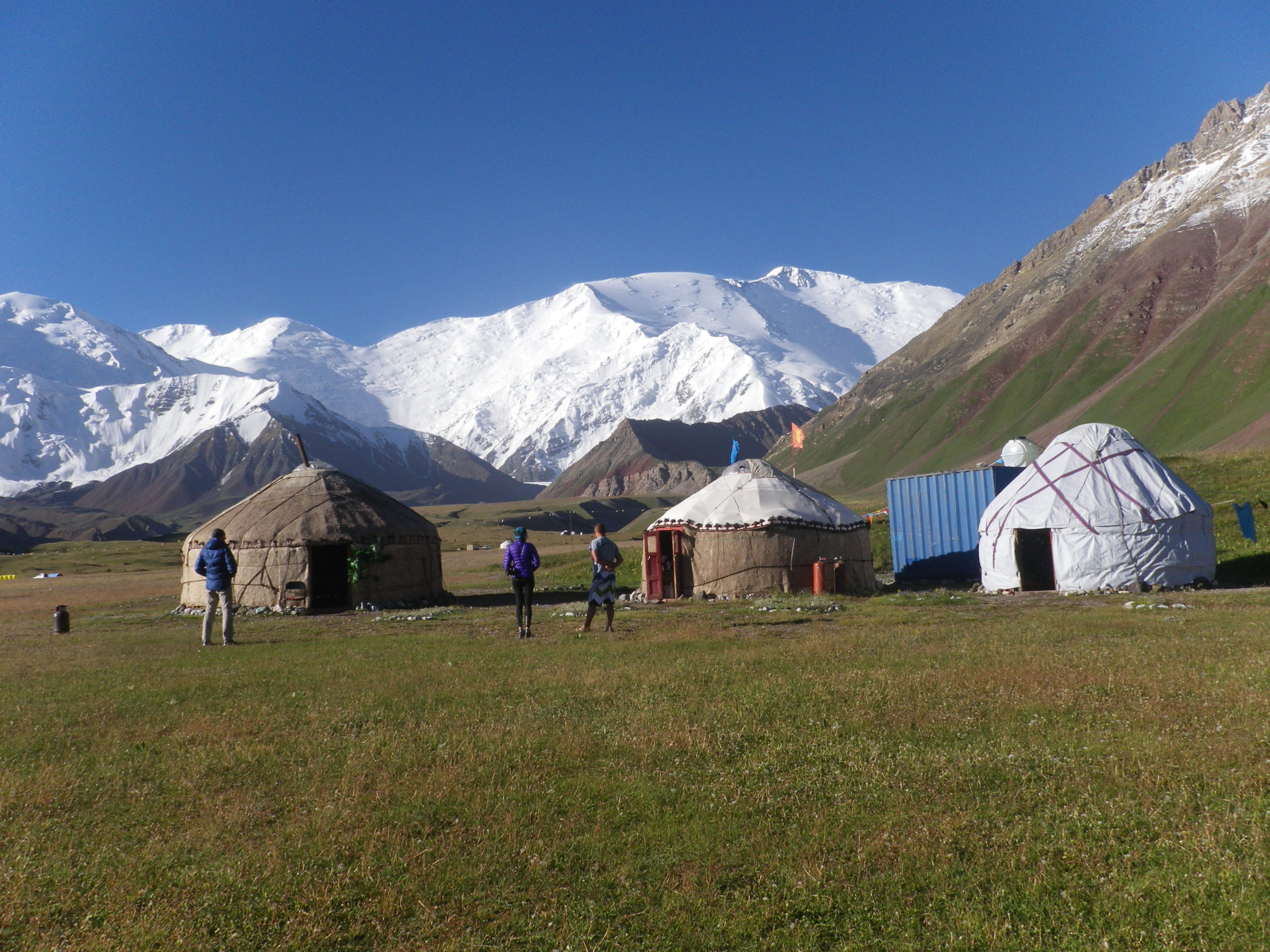 Baza je bila vzorno postavljena in urejeni šotori so bili v pravih matematičnih linijah. Vreme pa ni prikazovalo prevelike navdušenosti nad nami. Že ko pristaneš na letališču in ko najdeš vso prtljago, ti na obrazu zaigra skriti nasmeh. Tukaj v baznem taboru smo, tudi zaradi mraza, hitro začeli premetavati torbe. Realno stanje prispele prtljage po vseh teh poteh je bilo pomembno. Obetala se je tudi prva hladna, čeprav julijska noč. Sicer je bil dan že zelo dolg in močno nabit z dogodki in umirjanje in spanec sta kar silila čez obraz, a izkušnje so nam narekovale vrstni red dogajanja. Po dobri večerji v skupinski jurti, tako imenujejo velike kožne šotore, smo še pred grozečim nalivom opravili krajši višinski sprehod, ki bi nam koristil za aklimatizacijo in spanec. Dvignili smo se na višino štiri tisoč metrov, na vrh Puteshestvennikovega prelaza in nato kar v diru prehitevali prve kapljice dežja, ki so pokazale ljubezen gore do prišlekov. Hitro sem doumel bistvo in bil sem hvaležen za streho nad glavo.