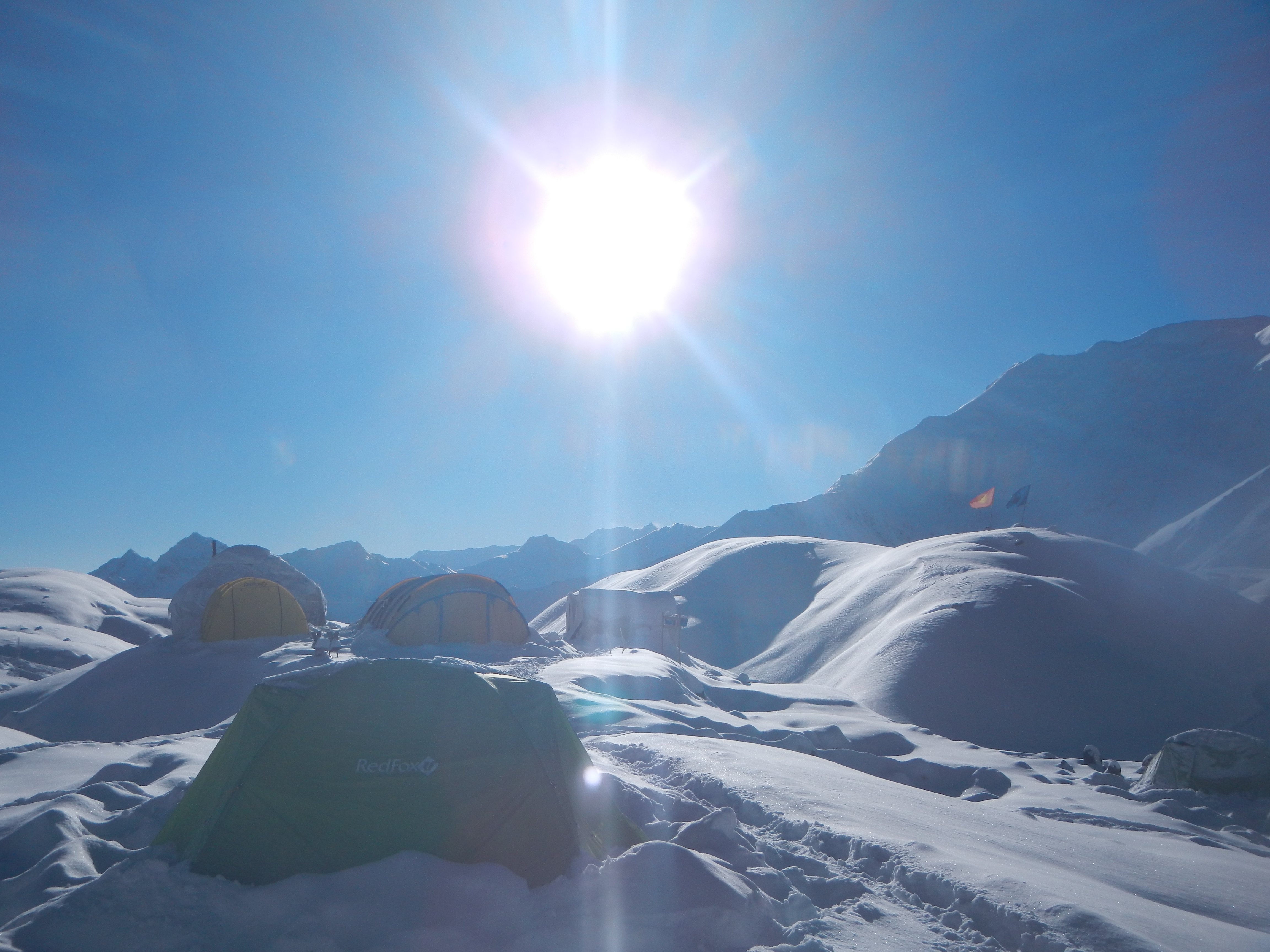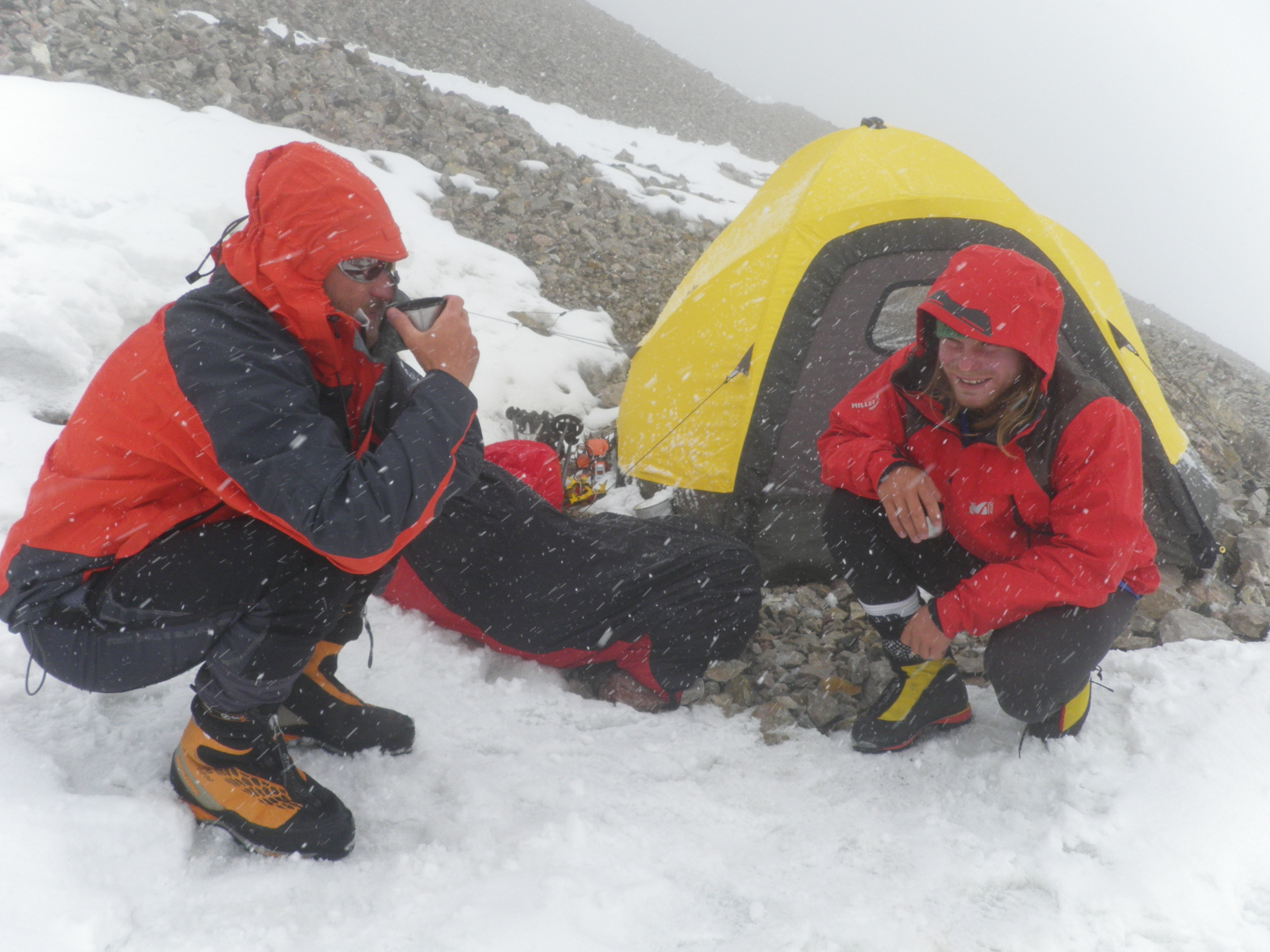 Zjutraj v bazi pa je bilo presenečenje, kot se spodobi za tako nadmorsko višino. Kljub mesecu juliju je zapadlo ponoči pol metra snega. Doma bi v takem trenutku dejali zimska pravljica, tukaj julija pa enostavno sranje! Za en dan je zastalo vso gibanje in vsi načrti. Sneg je pozno popoldan že skoraj izginil, a opomin gore je ostal prisoten, saj smo želeli riniti precej visoko. Ker smo se počutili močne, smo prvi možni dan hoteli našo bazo prestaviti v tabor ena –T1. S takim manevrom bi si prikrajšali kakšen dan mukotrpne hoje med bazo in T1. Izkoristili smo konje in nosače, ki se sicer v snegu nočejo pogajati za nošenje, a denar je povsod sveta vladar. Načrt je bil dober, vendar sem v naglici pakiranja pozabil precej vitalnih zadev. Konji so rezgetali, mi smo seveda morali stehtati prtljago, ki je smela v T1 na konjskih hrbtih in vse se je odvijalo v hitrem tempu. Kasneje sem doumel, da sem res preveč pošteno nameril svojih dvajset kilogramov za nosače. A delo je za denar in tudi tu se živi od denarja in ne od nasmeha in užitkov. Končno se je pojavil tudi naš vodnik, Artur. Bil je prijeten fant, vdan svojemu poslu. Jurij ga je najel za popoln uspeh na gori. Res se je kasneje pokazalo, da je bila poteza koristna.