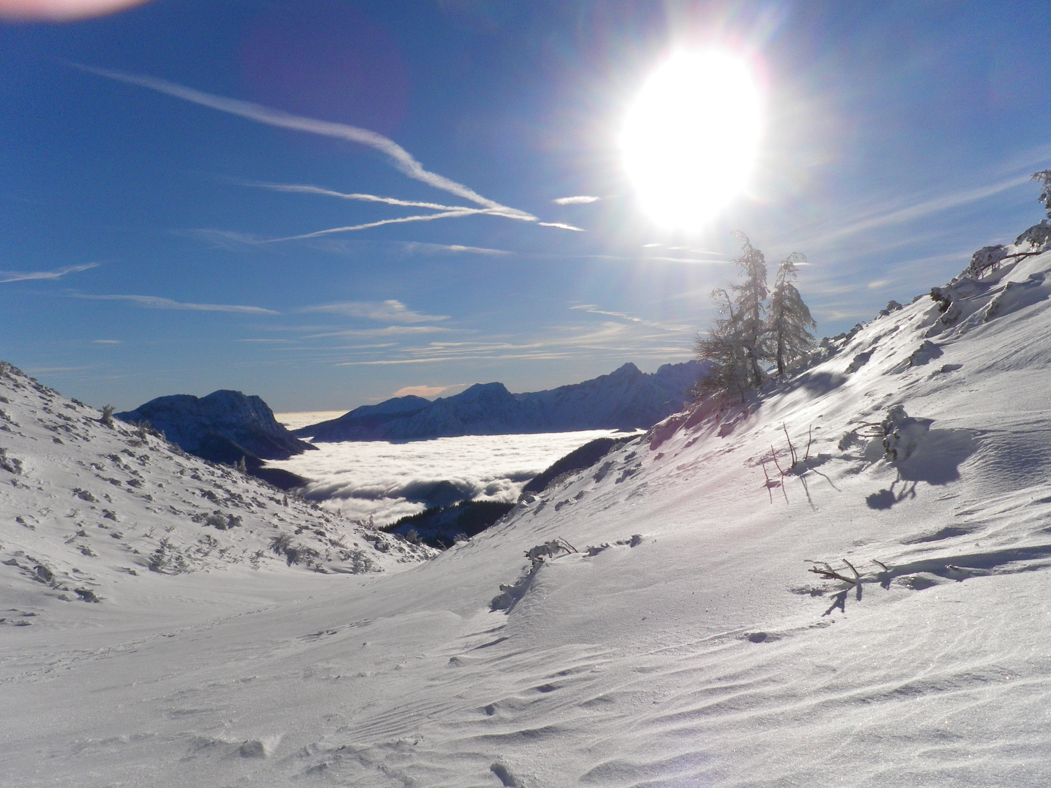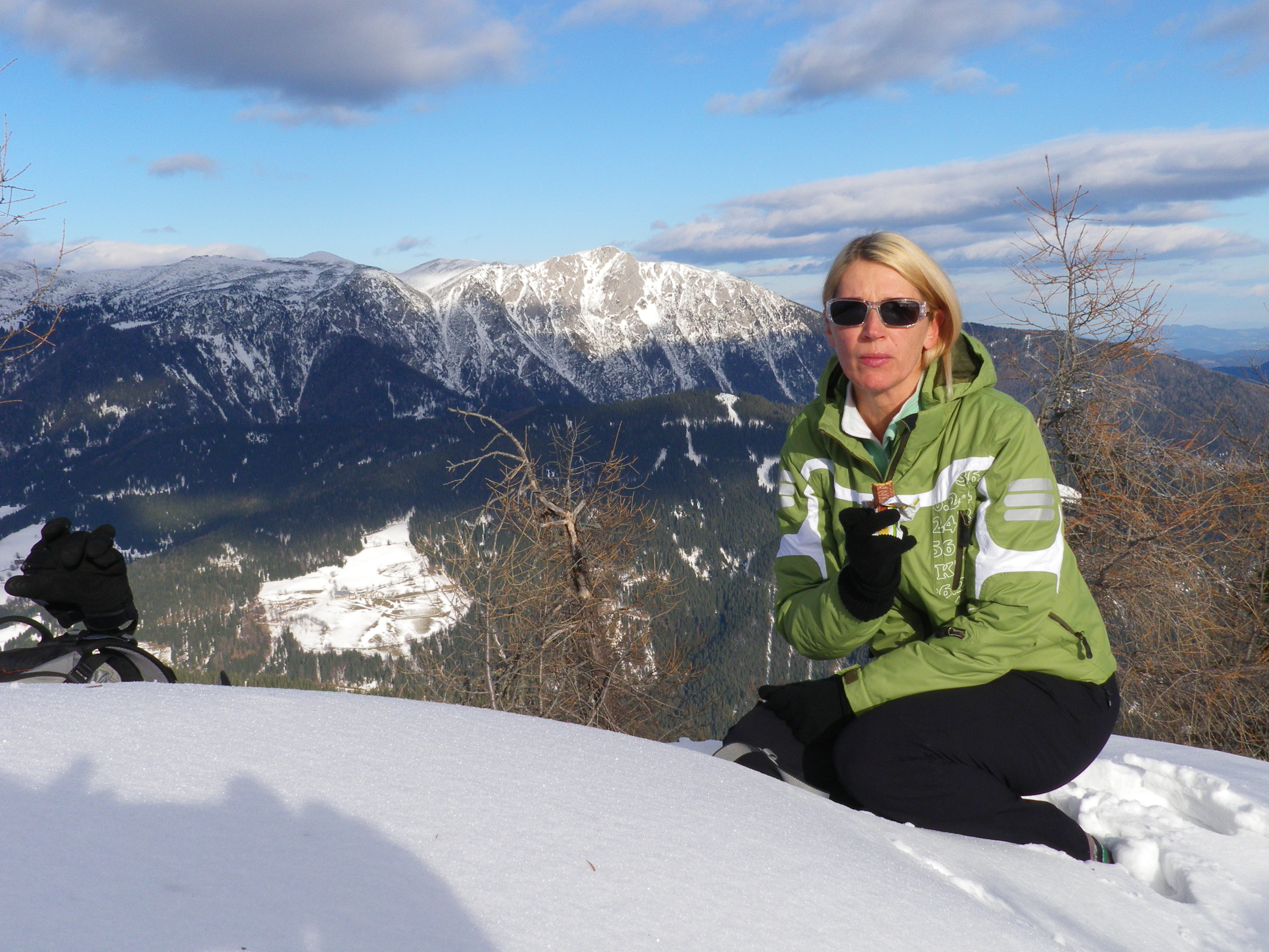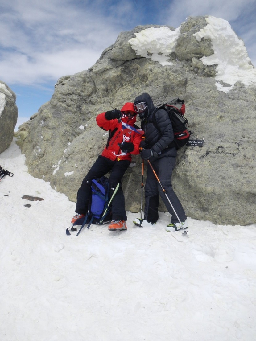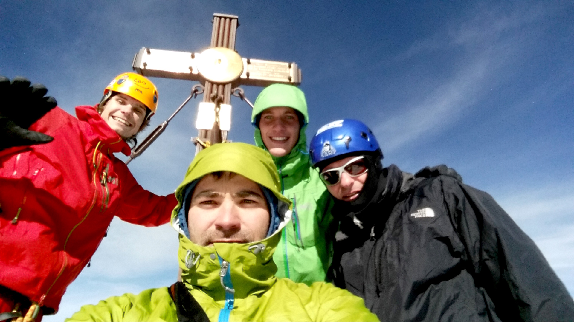 Kasneje sta nas zunaj varnega zavetja objemala tema in veter. Kljub mrazu smo bili veseli, saj je rezki hlad napovedoval lep dan. Prsti na rokah so občutili grizenje mrzlega vetra, ki je vlekel po ledeniku Teischnitkees. Podkapa in debele vetrovke so bile nuja. Je pa zelo velika popestritev gibanje po ledeniku. Dereze, cepin in pazljivi stopi ti lepo zapolnijo delo. Kljub vrtinčenju kristalov okoli nas, ki jih je neskončno nosil veter, je postalo iskanje prvih zlatih žarkov po vrhovih kar vzpodbudno. Nižje so lučke na čeladah barvale ledene stvore v lepe plavozelene skulpture. Zaradi mraza se nismo preveč obotavljali. Svetlikati se je začelo, ko smo prišli do stene. Navezali smo se v pare. Plezanje ob siju čelke je zanimivo, a verjetno bi nikoli tako radodarno ne vrgel pet evrov za nove baterijske vložke kot v taki situaciji. Le da bi našel čim lepše opore! Pa hlad. Še nekaj časa ni kazalo, da bi zaplezali na vzhodno stran gore in našli zlate žarke. Sončne žarke smo škodoželjno opazovali daleč iznad sebe. Zgornji par je hitro izginil nad nama. Bila sta mlajša in hitrejša. Resnično smo se vsi dobro zavedali, da bomo kar dobršen del dneva plezali. Pokazalo se je trenutno stanje v gori. Pršič! Mehek sneg, ki ga je bilo potrebno počistiti s skal je bil ovira več. Osvežitev pršnega plazu, ki ti ga je sprožil plezalec nad tabo je še dodatno »prijala«. A v gorah pač rešuješ trenutno situacijo in to je to. Kasneje, ko smo plezali po grebenu je bilo nekoliko lepše. Z vzhodne strani nas je obsevalo sonce in prijaznost gore je bila kljub vetru vsaj navidezna. Tudi svežega snega je bilo manj, saj veter in mraz preko noči opravita svoje. Med varovanjem soplezalca sem na južni strani na ledeniku Kodnitzkees že opazil barvne pike, ki so se gibale proti koči Adlersruhe. Kako prijetno toplo jim je na soncu. Dve »procesiji« sta prav počasi stopali po ravni gazi. Edina njihova skrb so bile le razpoke, ki so se od tu zgoraj dale razbrati prav solidno. A višine jim nisem zavidal, kajti čakalo jih je še veliko višinskih metrov! Z Jakijem, ki je bil moj soplezalec, sva si na varovališčih večkrat izrekla vzpodbudne besede. Mogoče se v tistih trenutkih sploh ne zavedaš, kako so potrebne tvojemu partnerju. Kolikokrat sem prav užival, ko sem pozimi cel dan, v tišini sam lomastil po Raduhi. Zdaj, doma, pa zares priznam, da sem potreboval nekaj dodatnega,… pa čeprav od sotrpina! Okoli poldneva se je začel tudi v steni topiti sneg. Bilo je prijetno za telo, a malo manj za dušo. Udarjanje s cepinom in derezami je moralo biti pazljivejše. Kljub veliki višini, se je sneg topil in plazil in varnejša je bila zdaj skala. A dodatno energijo sva dobila, ko sva nad sabo zagledala znameniti vrhnji križ. Res je bil še dosti višje, a uteha je bila, da sva na vrhu že prepoznala barve vetrovk najinih soplezalcev. Zavidal sem jima užitek! Šerki in Gašper sta krilila z rokami, kot da bi nama to karkoli pomagalo. Ne, na goro greš in odvisen si le od sebe! Še je minilo nekaj časa, preden sva si z Jakijem lahko segla v roke na vrhu, a vsaj videla sva že izhod, kar je velika vzpodbuda. Šerki, Gašper, Jaka in jaz na vrhu, pri križu, najvišje gore v Avstriji, 3798m visokega Grossglocknerja.