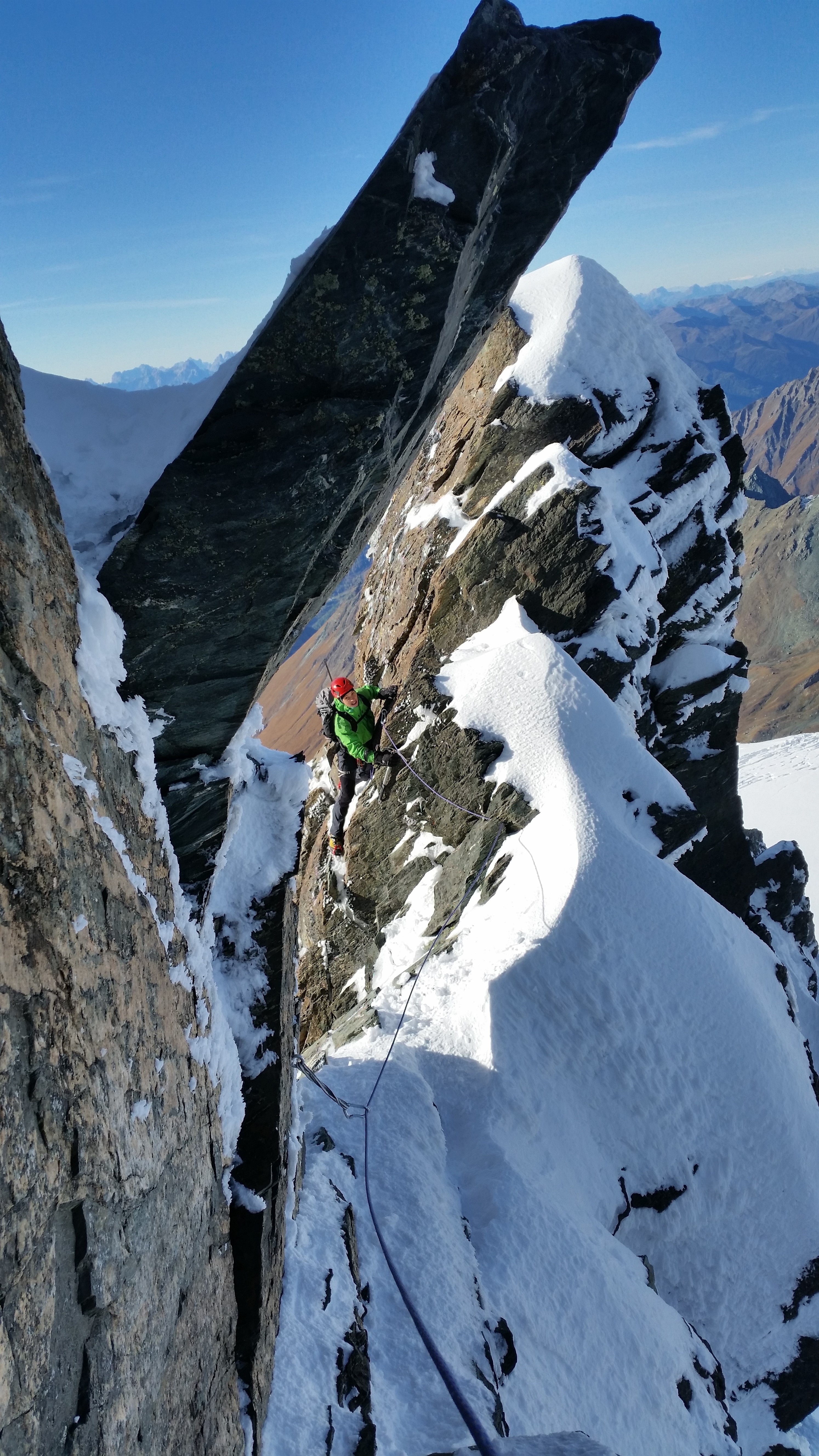Tokrat je naša skupina štela štiri vzdržljive fante s čeladami in dva šoferja, ki sta bila res dobrodošla za dolgo pot od doma. Skozi avstrijska mesta, Spittal, Lienz, Matrei, smo se podili zelo hitro, a mrak nas je vseeno presenetil pred gorskim parkiriščem nad Kalsem. S čelkami na glavah smo se zapodili proti lepi gori, katere vrh se je še svetlikal v zadnjih žarkih zlatega sonca. Namen je bil, da si za drugo jutro vsaj malo prihranimo čas in moč. Ne kot antilope, kot izmučene, enogrbe kamele smo že čez debelo uro pozdravili v zaspani koči Studlhutte. Itak, odgovora ni bilo. Koča je skoraj samevala, saj je bilo najavljeno sezonsko zaprtje do pomladi. Vremenska napoved za nekaj dni, za predel Grossglocknerja pa je bila lepa. Ko tako zmahan privlečeš tovor v kočo, najprej začutiš željo po rehidraciji. Tekočina v pivski steklenici se kar ujema z željo. Seveda se nato pametovanje in načrtovanje potegne v nočne ure, a zavedanje za vstajanje v ranih urah nas je vseeno prisililo na skupna ležišča v zelo urejeni koči. Nisem bil prvič v tem pogorju in tudi višina, sicer že spoštovanja vredna, kot vrh Triglava, ni bila vzrok za nespečnost. Glava je bila nabita z mislimi za sledeči dan. Zimski Studlgrat! Obetale so se nore dogodivščine s fanti, ki so mi zelo blizu. Nisem in nisem se zmogel prisiliti v miren spanec, kljub dihalni tehniki, ki jo k sreči že kar obvladam. Pozno, pozno ali zgodaj, zgodaj sem zaspal. Vstajanje, bolj tako mežikanje z levim in z desnim očesom nas je hitro spravilo izpod pokrova koče. Ponudba zajtrka je bila vrhunska. Zavedali smo se, da bo to glavno gorivo preko celega dne in topla naložba v želodec vedno prija.